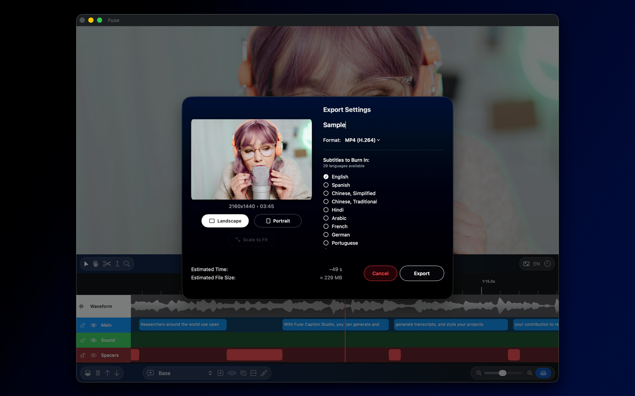 Fuse Caption Studio leverages the power of Whisper, a state-of-the-art AI model from OpenAI, for transcription.