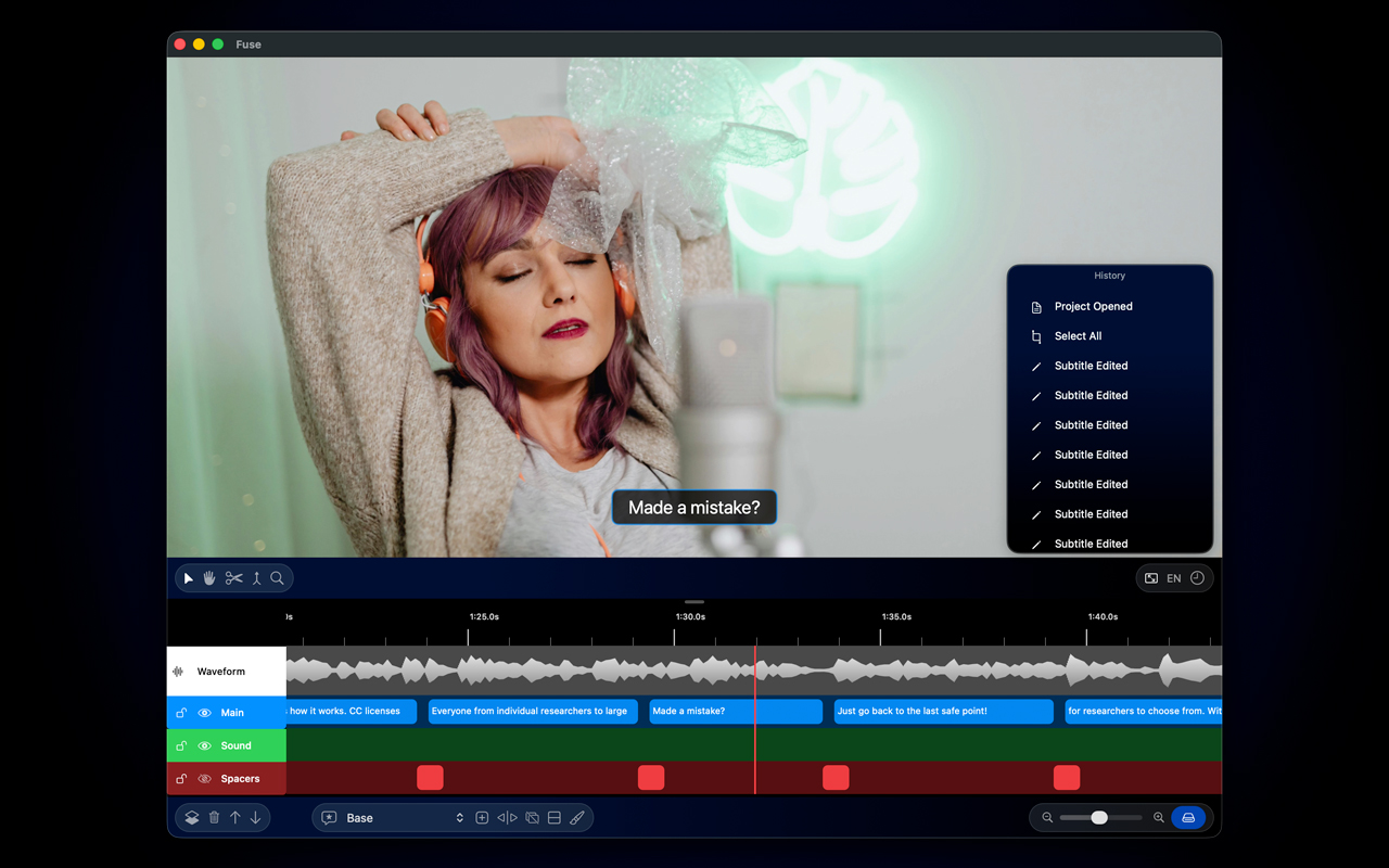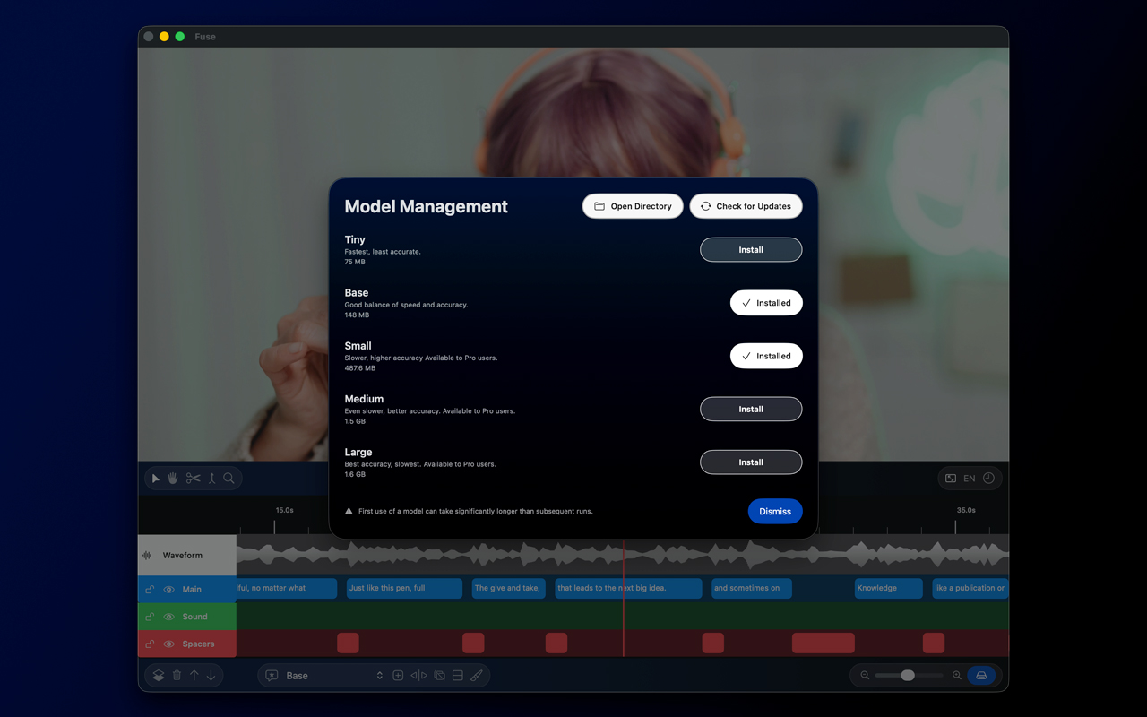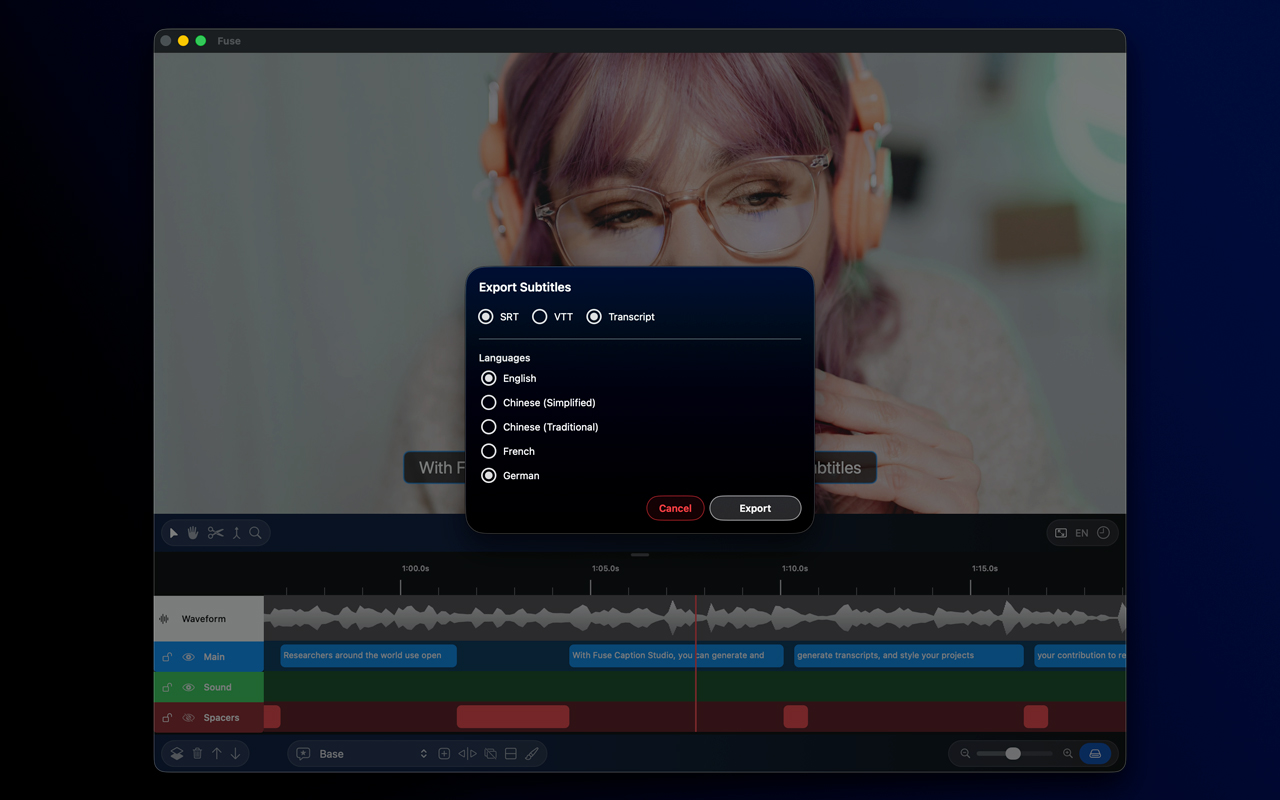 Since all of our transcription and processing models run locally on your Mac, you can use Fuse Caption Studio completely offline.